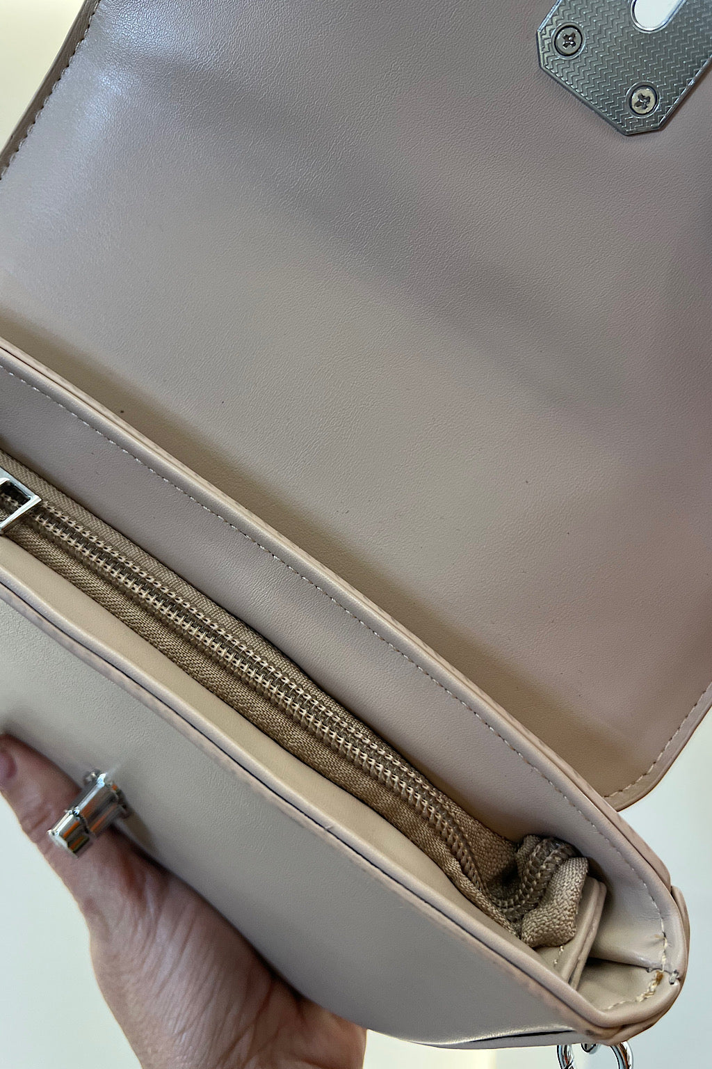 Cierre: Broche metálico giratorio (Turn-lock) en acabado plateado.