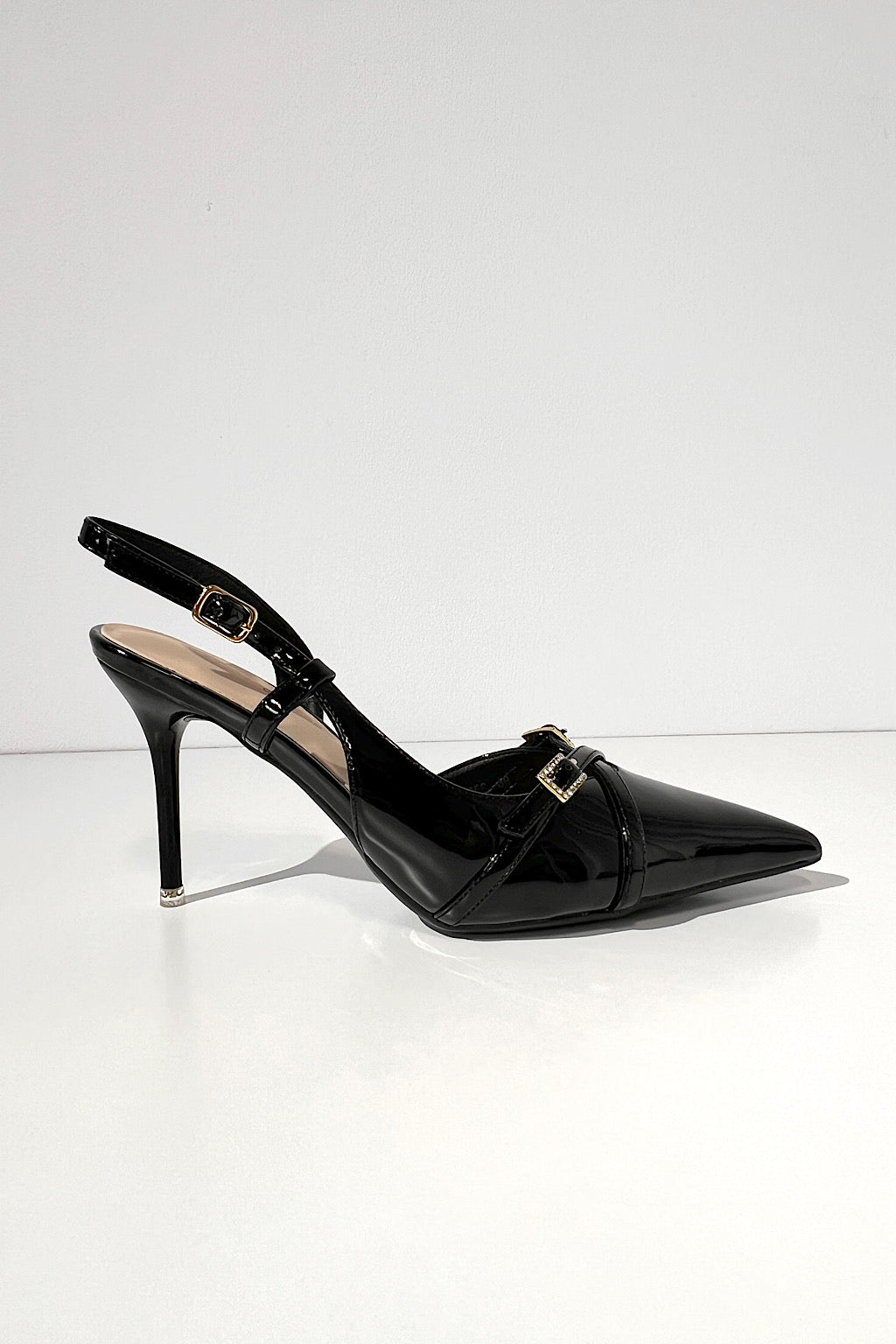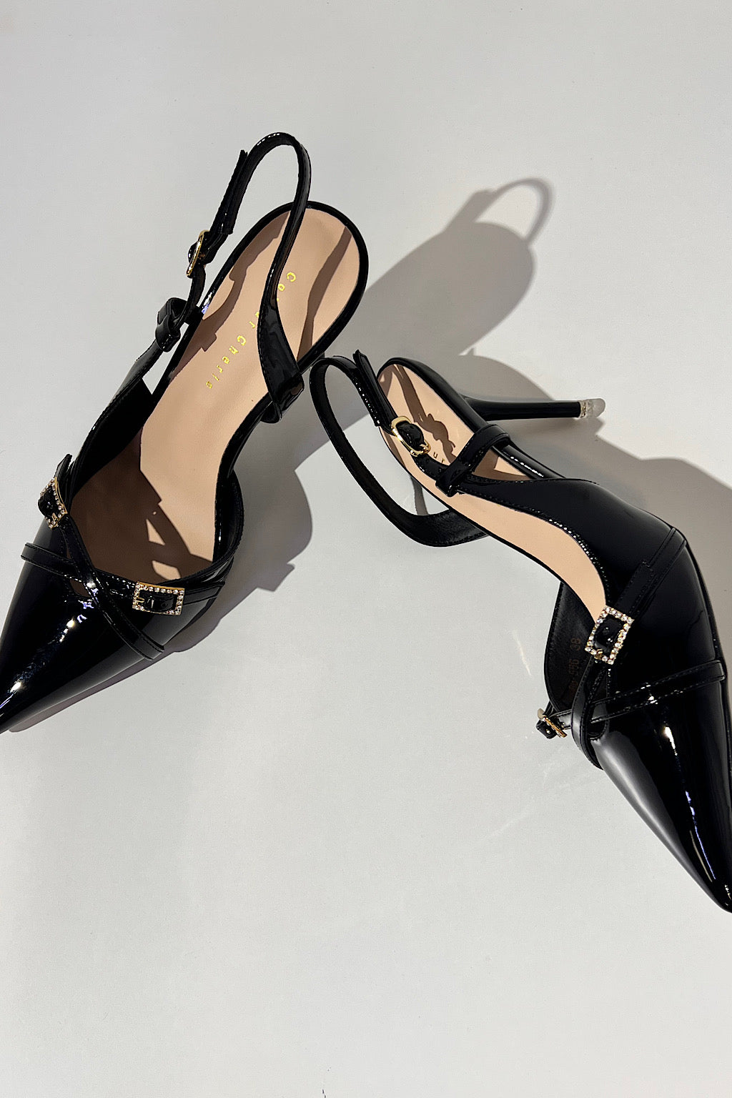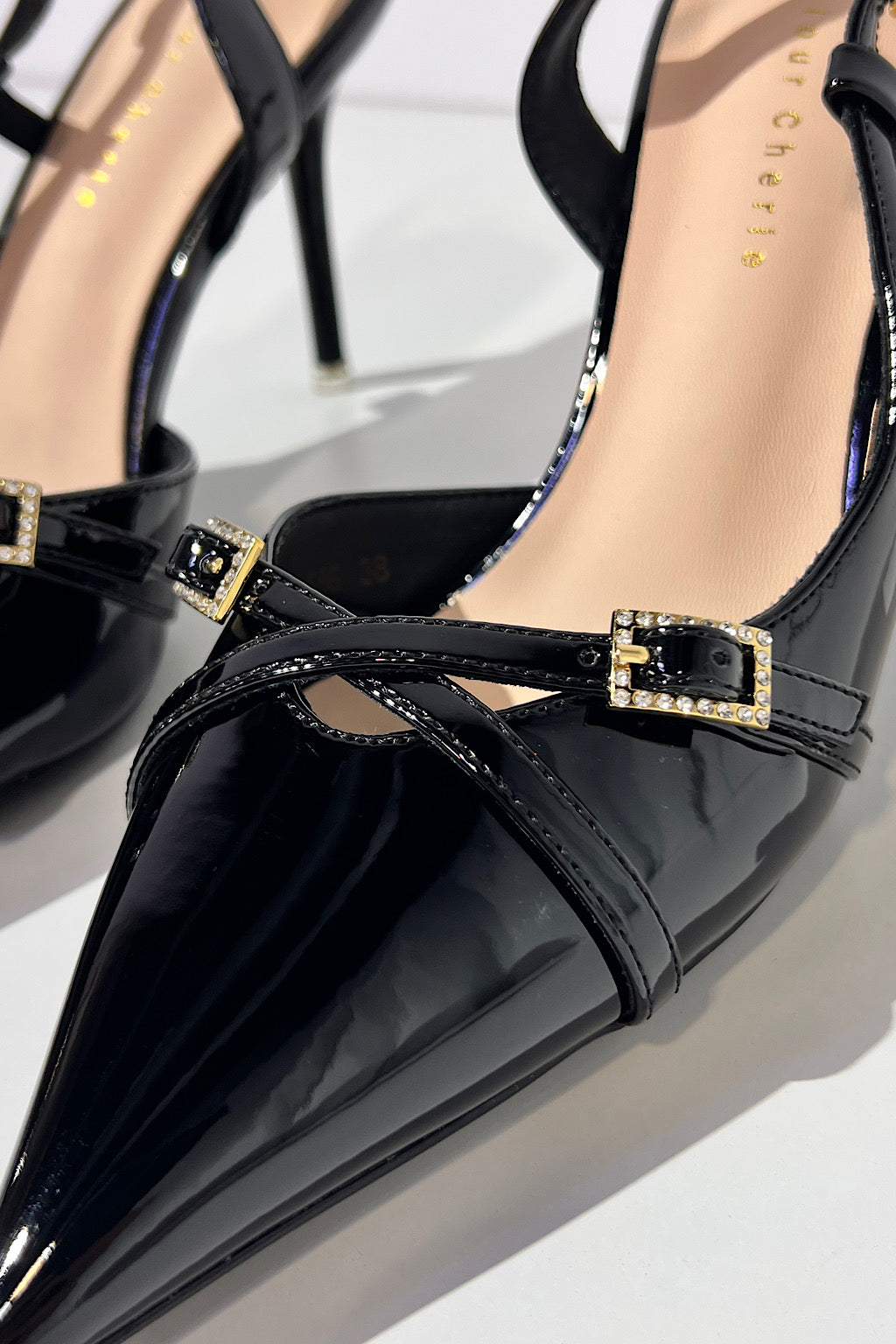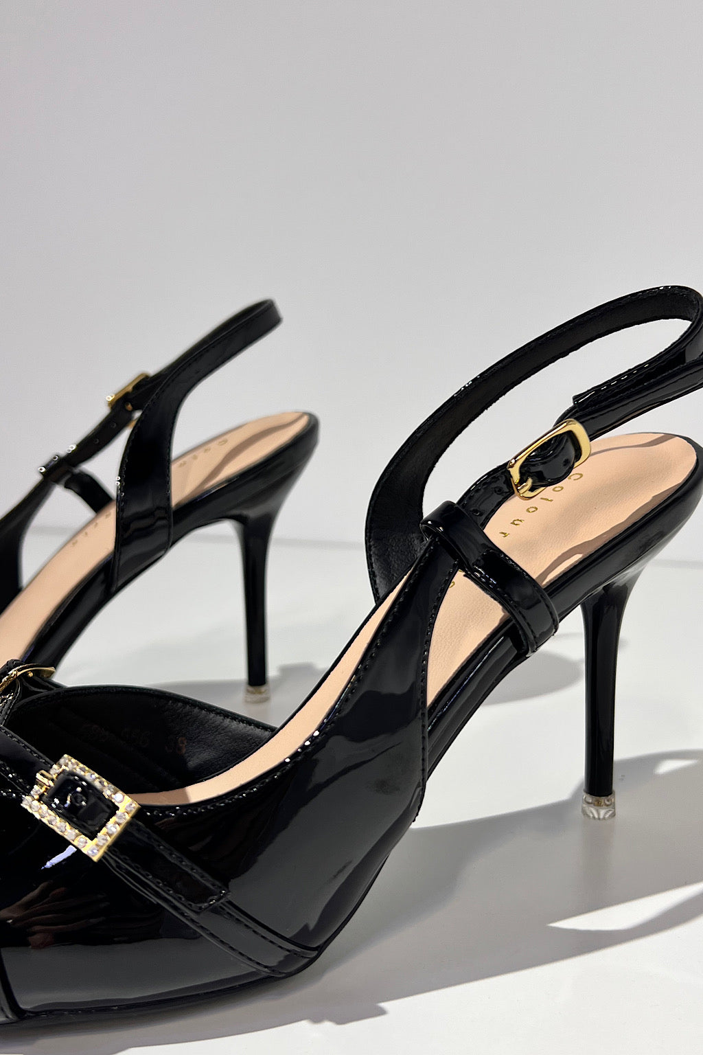 Un diseño icónico y femenino que combina la elegancia del salón clásico con la ligereza de un destalonado. Confeccionados en material efecto charol negro, estos salones estilizan la silueta gracias a su punta fina y tacón de aguja. Las finas tiras cruzadas con hebillas doradas y detalle de brillo aportan un toque sofisticado y glamuroso, perfecto para elevar cualquier look, desde un evento especial hasta una noche elegante.