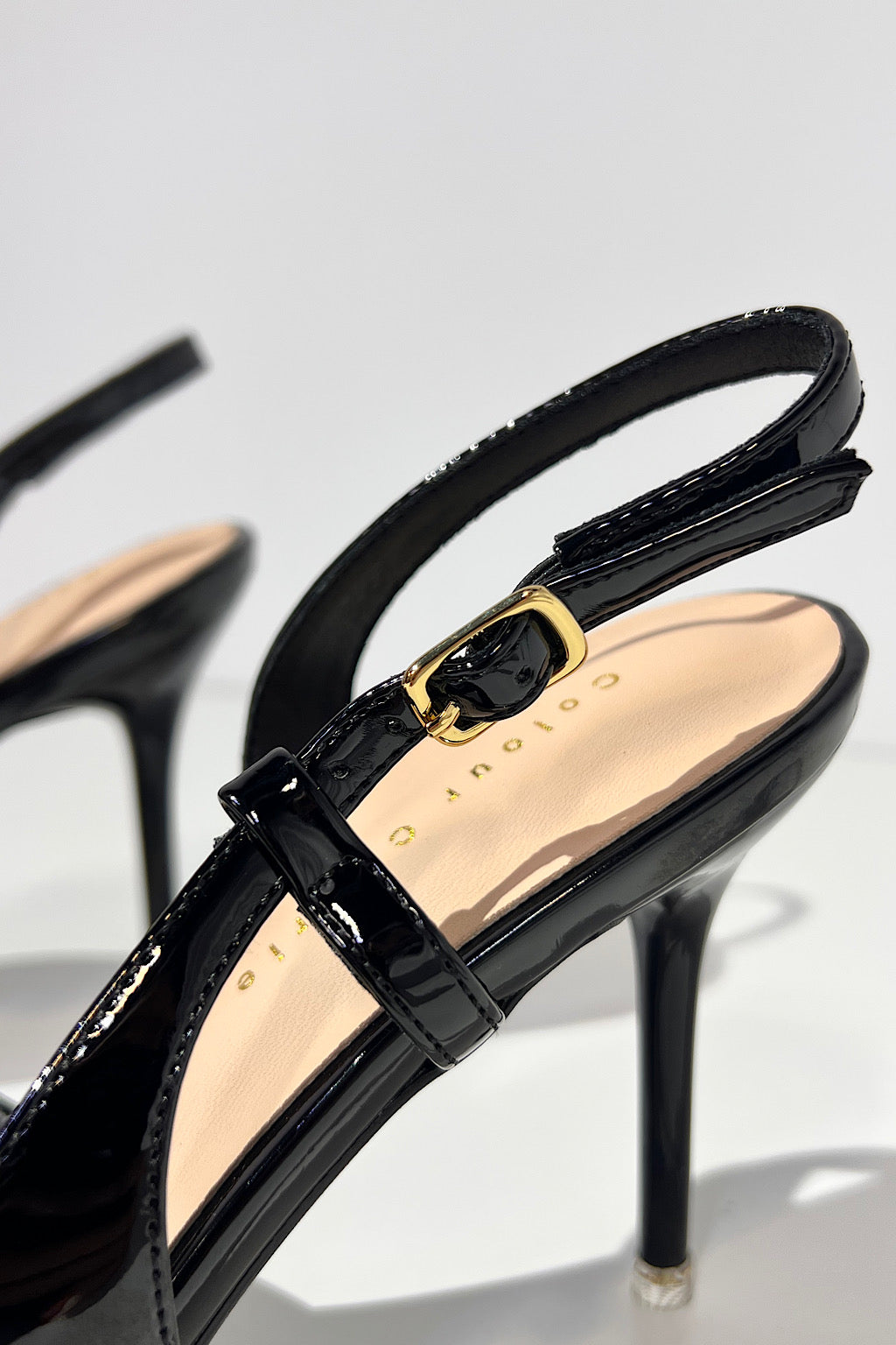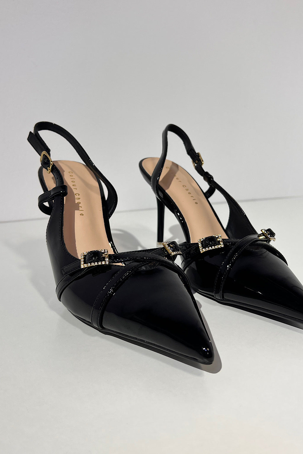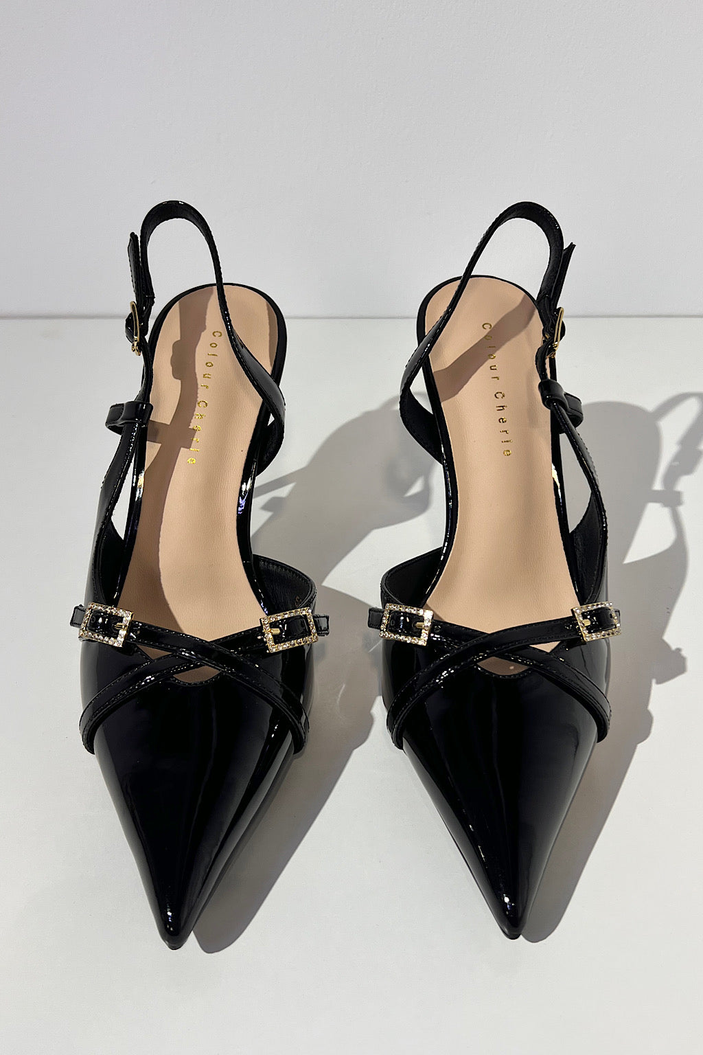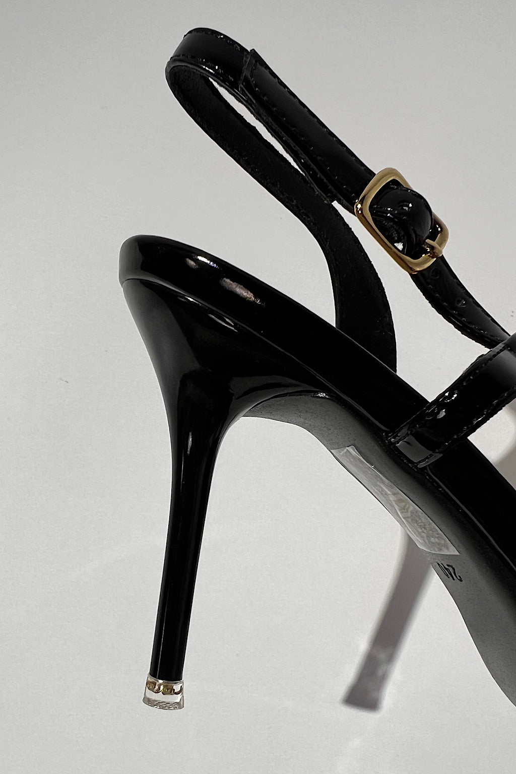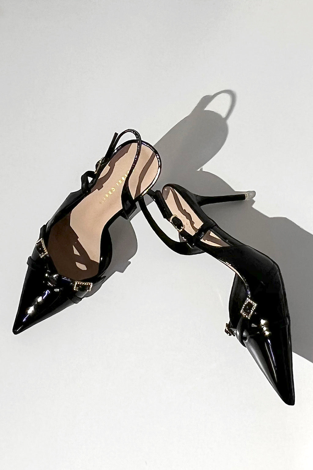 Un diseño icónico y femenino que combina la elegancia del salón clásico con la ligereza de un destalonado. Confeccionados en material efecto charol negro, estos salones estilizan la silueta gracias a su punta fina y tacón de aguja. Las finas tiras cruzadas con hebillas doradas y detalle de brillo aportan un toque sofisticado y glamuroso, perfecto para elevar cualquier look, desde un evento especial hasta una noche elegante.