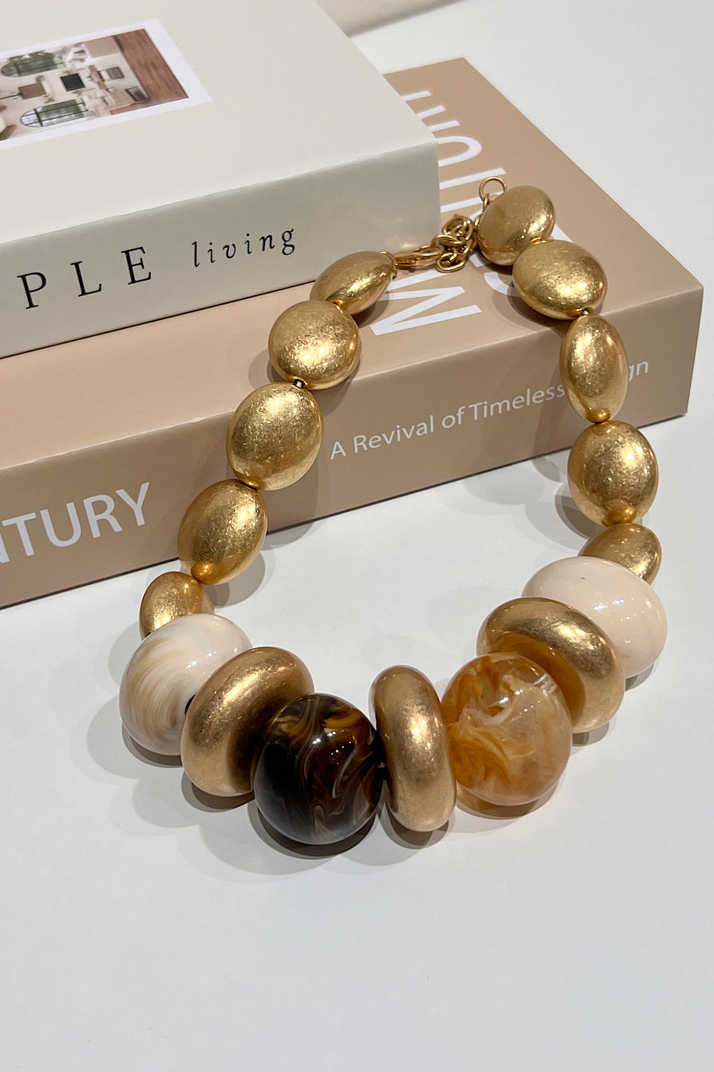 Descubre la opulencia discreta y el encanto atemporal con nuestro collar "Dorado Imperial". Este diseño majestuoso presenta una secuencia de cuentas doradas mate, que irradian una luz cálida y sofisticada. En su parte central, se entrelazan armoniosamente cuentas de resina en tonos crema jaspeado y ámbar con destellos, aportando una riqueza visual y una textura orgánica que lo hacen verdaderamente único. La combinación de metales preciosos y acentos naturales crea una pieza versátil, perfecta para elevar cualquier atuendo, desde un look casual chic hasta un elegante conjunto de noche. El Collar "Dorado Imperial" no es solo un accesorio, es una declaración de estilo y buen gusto.