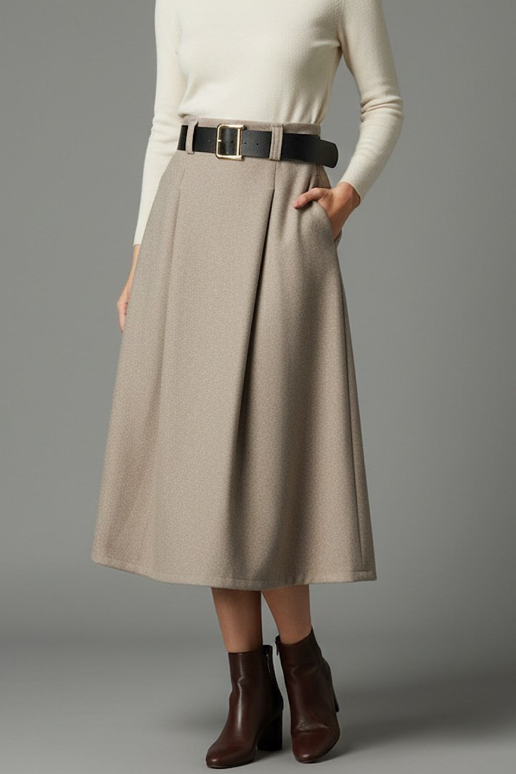Esta elegante falda midi de estilo A-line se presenta en un sofisticado color borgoña jaspeado. Su tejido de tacto suave y cuerpo es perfecto para los meses de frío. El diseño cuenta con una cintura marcada que incluye un cinturón ancho en contraste (posiblemente negro o m con una hebilla metálica, aportando un toque moderno y estructurado. Su corte acampanado y largo por debajo de la rodilla garantiza un movimiento fluido y una silueta muy favorecedora, ideal tanto para un look de oficina como para eventos elegantes.
