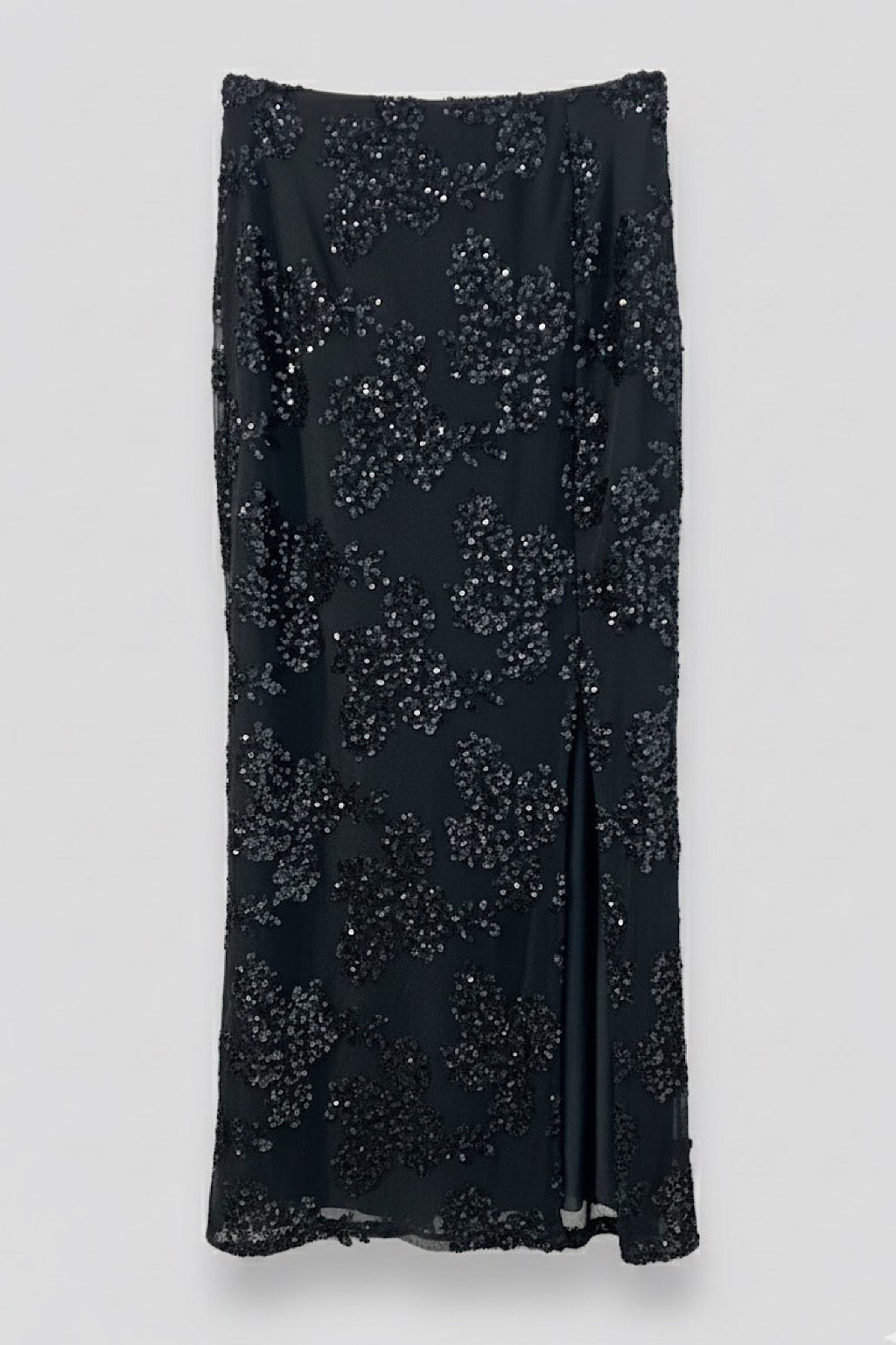 Esta deslumbrante falda larga de corte ajustado es la pieza ideal para eventos y ocasiones especiales. Confeccionada en un tejido negro, está completamente adornada con lentejuelas y abalorios negros dispuestos en un elegante patrón floral o de hojas a lo largo de toda la prenda. Presenta una abertura lateral o en el muslo para un movimiento fluido y un toque sensual.