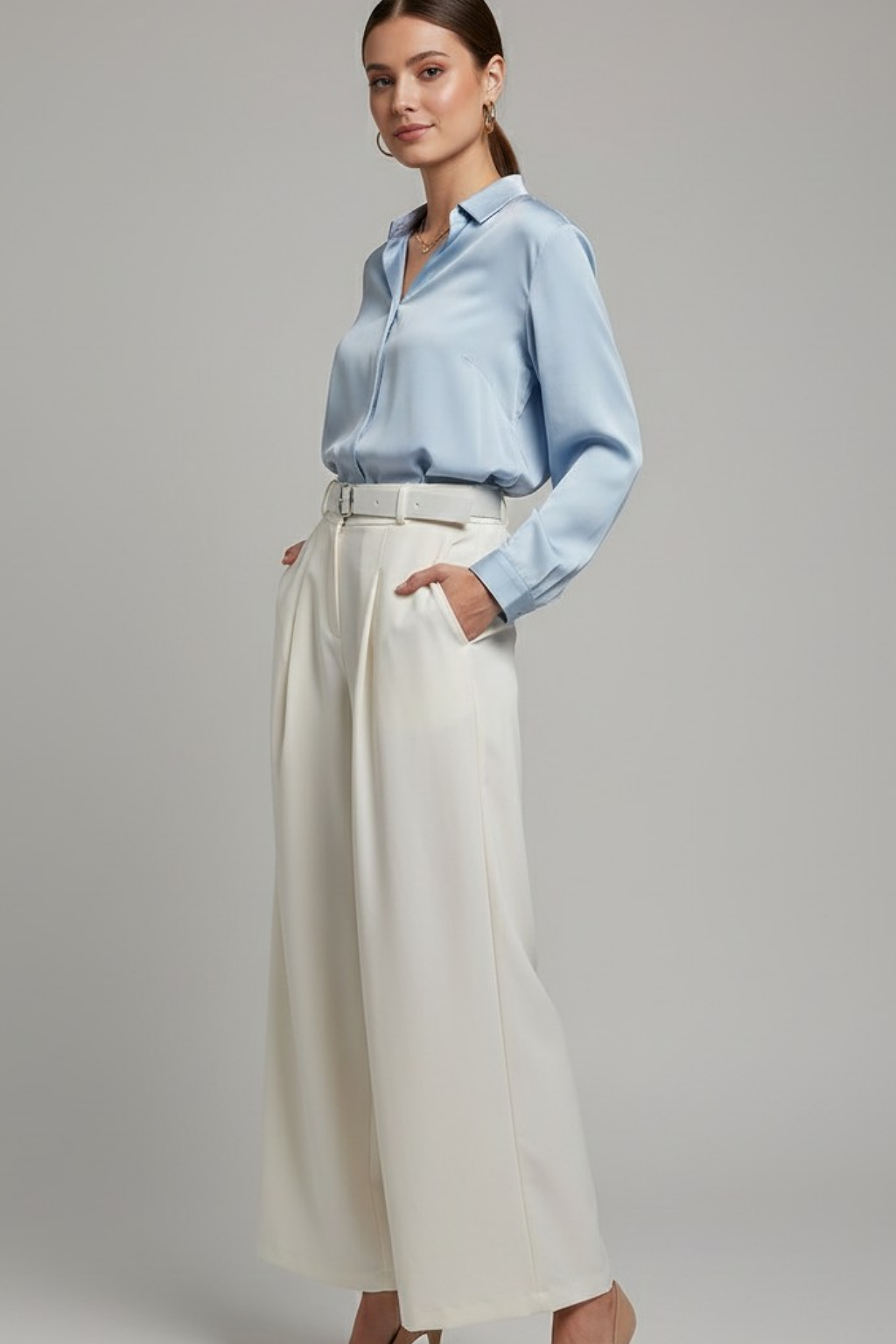• Corte: Tiro alto con caída fluida y pernera ancha.