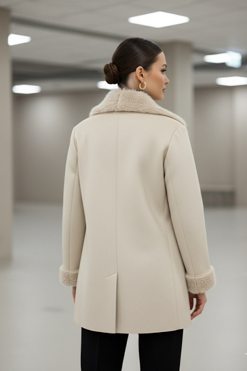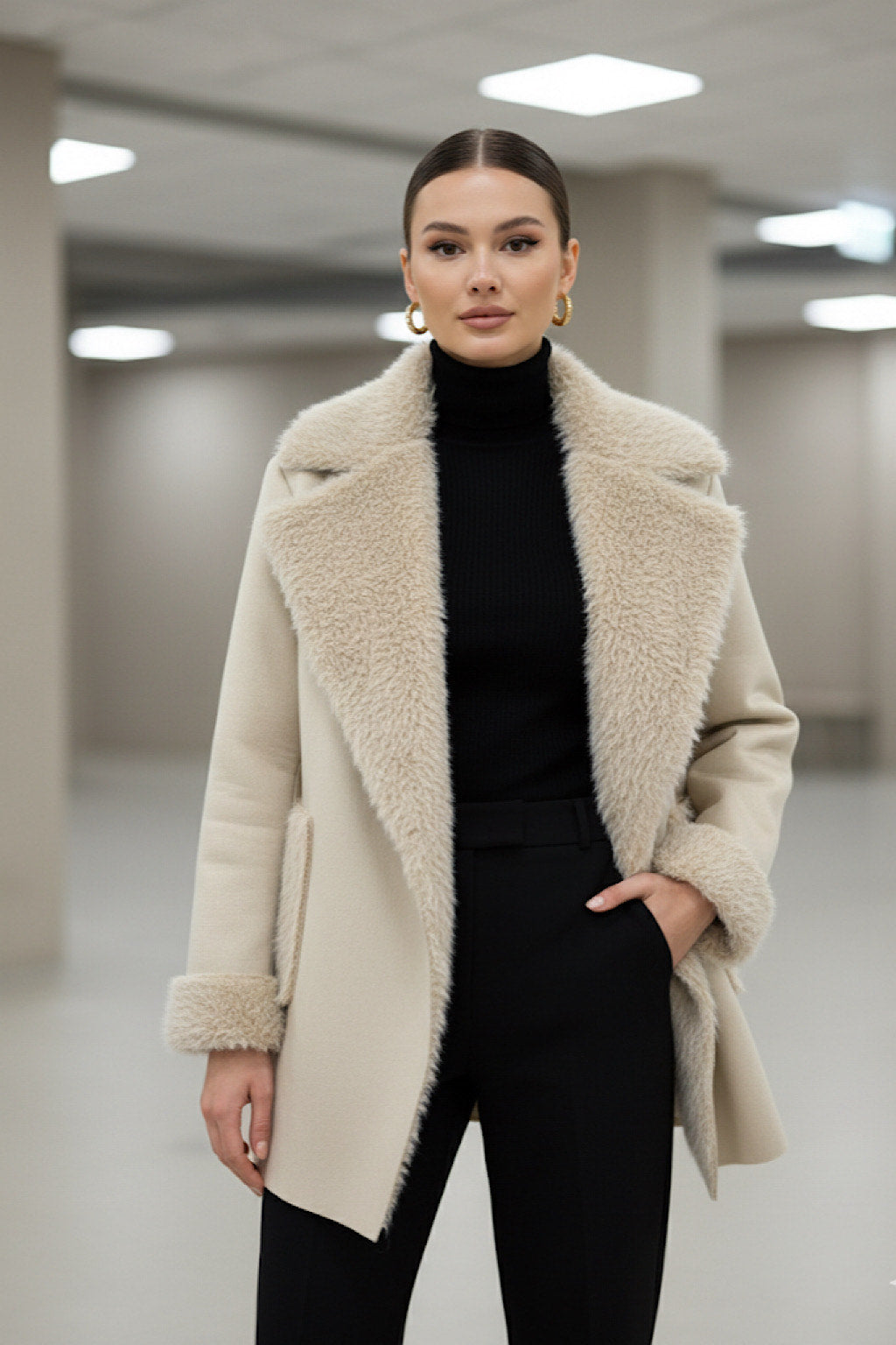 Este elegante abrigo se caracteriza por su diseño moderno y su textura cálida.