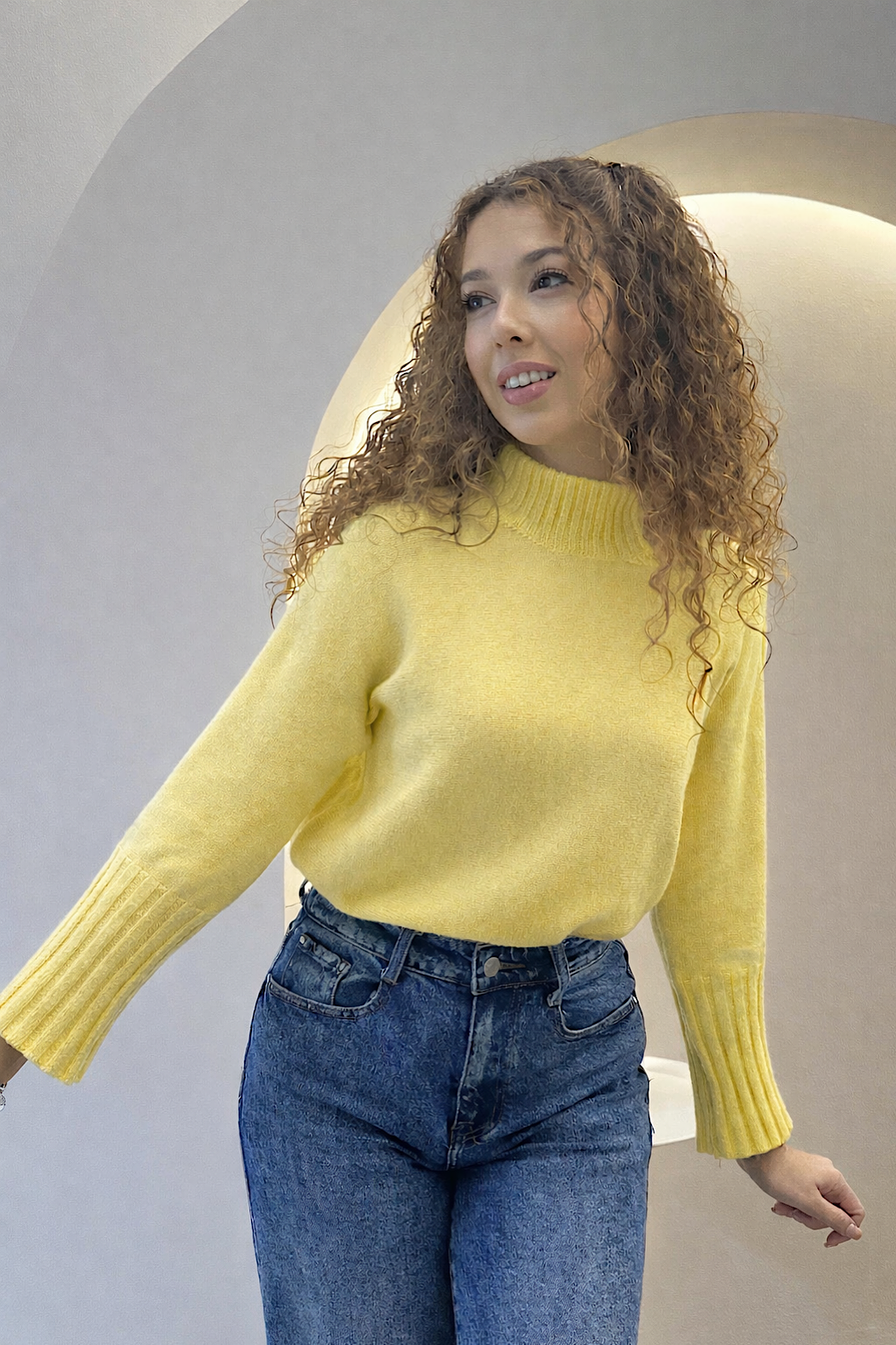 Este jersey de punto suave con cuello alto, diseñado para aportar calidez y estilo en tu día a día. Su tejido ligero y agradable al tacto ofrece una caída natural y un ajuste cómodo, perfecto para combinar con vaqueros o pantalones de vestir. Un básico versátil en un tono luminoso que realza cualquier look.